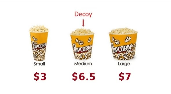 Aquesta tècnica s’anomena “Decoy effect” en anglès i “efecto señuelo” en castellà. És el fenomen pel qual els consumidors canvien les seves preferències de compra quan se’ls hi presenta una tercera opció. S’aconsegueix fent que aquesta tercera opció actuï d’esquer i sembli dolenta perquè el consumidor es decanti per l’opció més bona (la més bona pel venedor, es clar!). En definitiva, que el consumidor triï l’opció que ha estat preparada pel venedor per a ser escollida pel comprador.